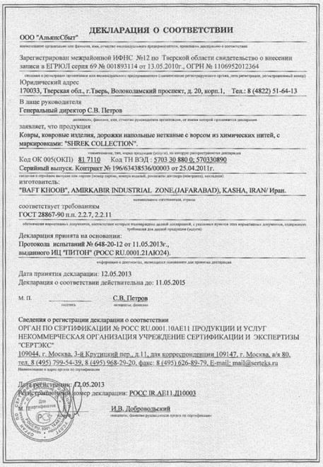 Каждый ковер имеет сертификат качества